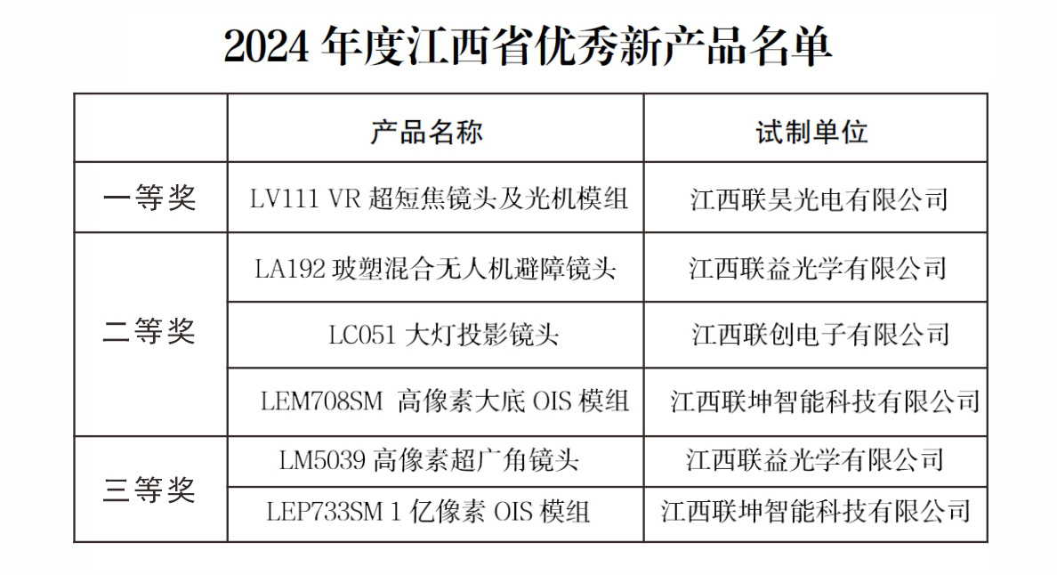 【概要描述】2025年8月13日,江西省工业和信息化厅发布《关于公布2024年度江西省优秀新产品名单的通知》中,联创电子旗下四家成员单位凭借卓越的自主研发能力,共获一等奖1款、二等奖3款、三等奖2款,充分体现了公司在技术创新和产品研发方面的综合实力。